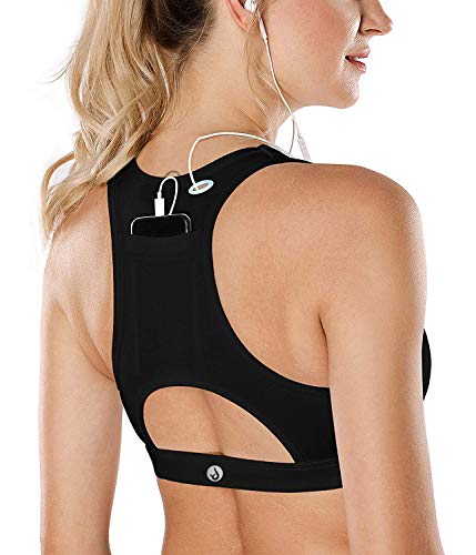 DeepTwist Mujer Sujetador Deportivo Acolchado Impacto Medio Sport BH Racerback Phone Bolsillo Trasero,UK DT150 Black S